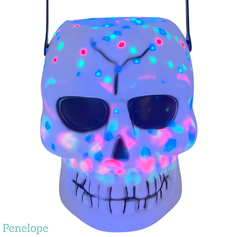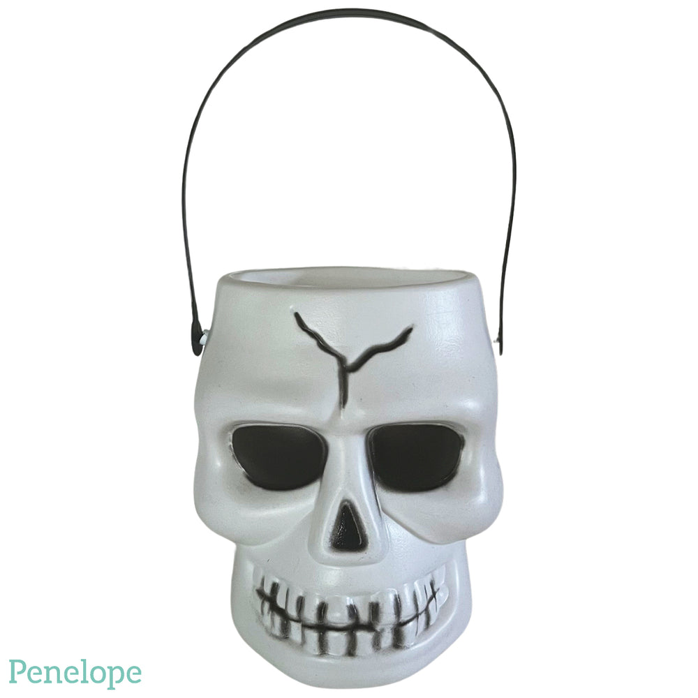 דלי בצורת גולגולת לבנה מנגנת ומאירה בלחיצת כפתור (פועלת עם סוללות).